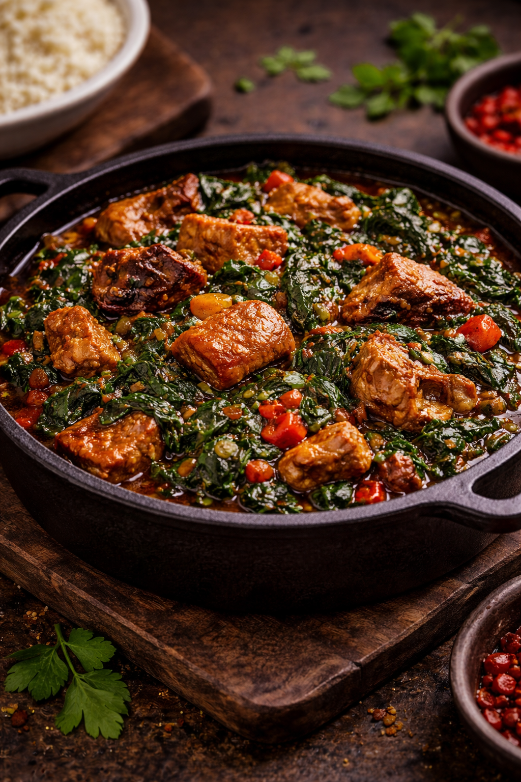 Traditional Nigerian spinach stew cooked in a rich pepper sauce with tender meat or fish. Bold, comforting and full of flavour.