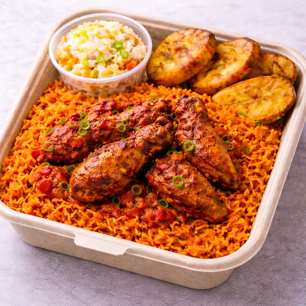 Smoky Jollof Rice served with crispy seasoned chicken wings and sweet golden slices of Fried Plantain. A bold West African favourite with just the right balance of spice and sweetness.