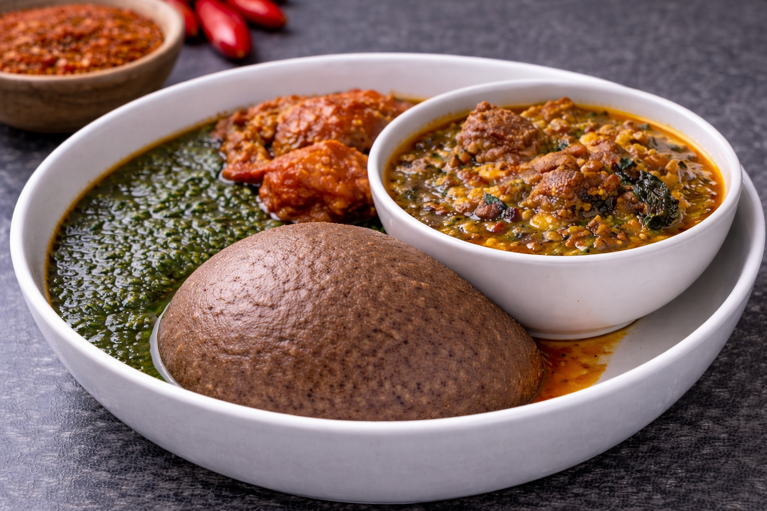 Soft, earthy and traditionally prepared yam flour swallow with a smooth, slightly elastic texture. Amala has a rich, deep flavour that pairs perfectly with Nigerian soups.