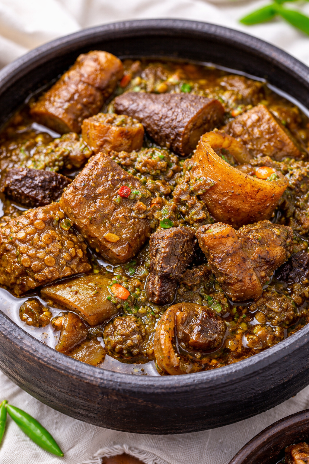 A bold Yoruba pepper stew cooked with assorted meats and traditional spices in a rich palm oil sauce.